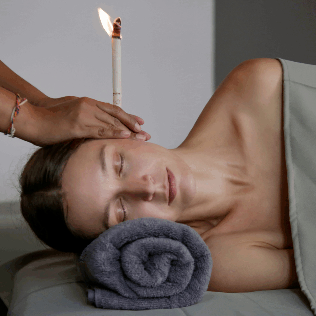 A non-invasive, relaxing treatment that takes about 30 minutes. The ear candle is lit on one end and the other end lightly sits in the ear, heat is not felt in the ear canal.The negative charge of the herbal smoke and shape of the candle work together to stimulate the respiratory system and cleanse and release build up. The gentle vacuum effect of fire causes debris to be drawn up the candle
